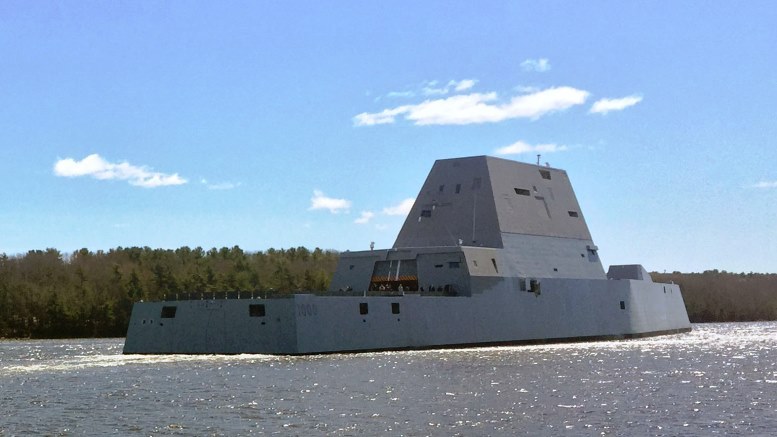 The future guided-missile destroyer USS Zumwalt (DDG 1000) departs Bath, Maine, on April 20, 2016, to conduct acceptance trials with the Navy's Board of Inspection and Survey. (U.S. Navy photo)